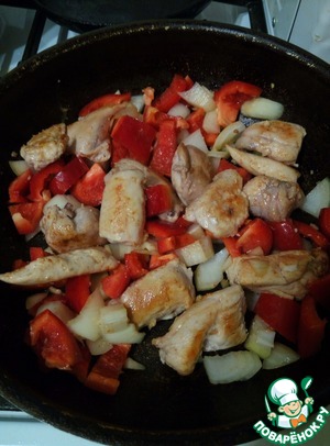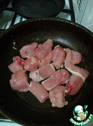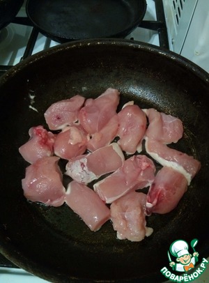 Куриное филе промываем, режем на кусочки и обжариваем на среднем огне до золотистой корочки
