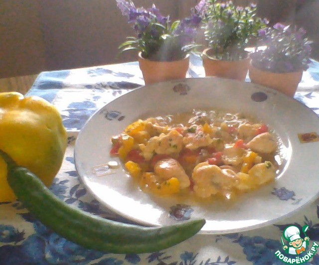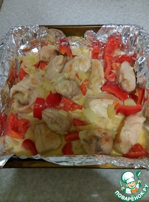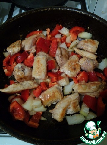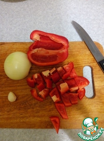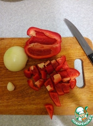 Пока жарится курочка, подготовим овощи. Перец, лук и чеснок режем произвольно, лучше крупно.