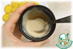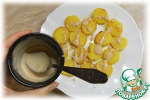 Выложить обжаренные овощи поверх картофеля. Так же полить соусом.