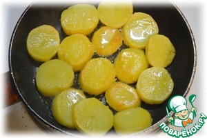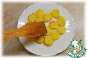 Картофель отварить в мундире и порезать кружочками. Обжарить до хрустящей корочки на оливковом масле.