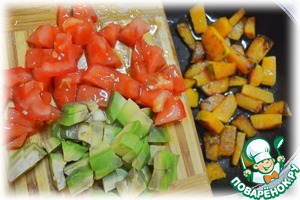 Помидоры (семена оставить) и авокадо порезать кубиками. Добавить их к обжаренной тыкве и