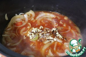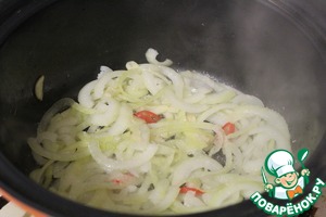 Разогреть сковороду с маслом и слегка обжарить лук, чили и чеснок, но НЕ зажаривать!