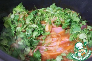 Укладываем куски рыбы на дно, а соус с луком поверх рыбы- соус не должен покрывать рыбу, а только доходить до конца, посыпаем нарезанной зеленью, но не всю, немного оставить и тушим 10 минут под крышкой.