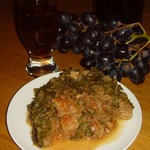 Добавить помидоры, порезанные кубиком и без кожицы, орехи, томат пасту, посолить и поперчить, влить 150 мл воды. Когда не сезон помидоров, как сейчас, я использую просто томат пасту - 2 ст. л. с верхом и 200 мл воды, и делаю совсем не простительную вещь для грузинской кухни - добавляю щепотку сахара и все это великолепие тушить 10 минут.