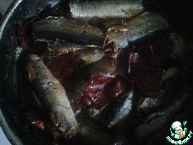 Ставим кастрюлю на небольшой огонь. Здесь важно, чтобы после закипания рыбка не кипела сильно, а слегка томилась. Шпроты необходимо тушить 2-3 часа. У меня вышло где-то 2 с половиной, нужно через 2 часа попробовать рыбку, если вас устраивает, значит готово, мне показалось что косточки не совсем разомлели, вот и тушила дольше. Когда рыбка будет готова, оставьте её в кастрюльке до остывания. Мои, правда начали уже горячую тягать с кастрюли. Я оставила шпроты в кастрюле на ночь, утром мне показалось, что она стала немного солонее, я вытащила её в контейнер, залила свежим маслом и поставила в холодильник.