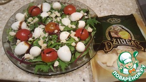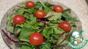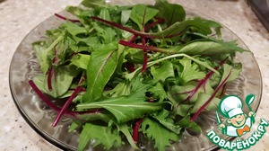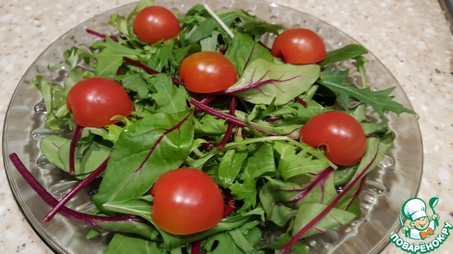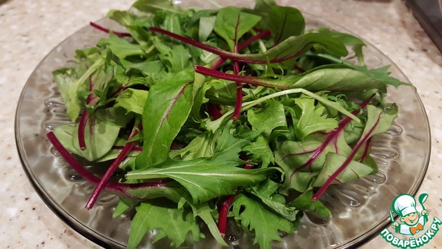 Салат выкладывается сразу на тарелку. Сначала салатный микс.