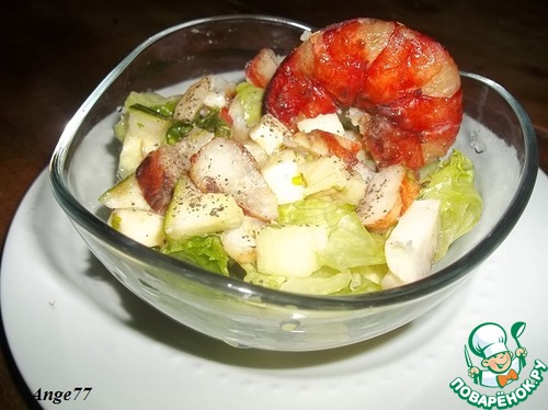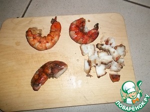 Креветки, приготовленные любым способом, нарезать. У меня креветки запекались в духовке 5 минут. Самые красивые оставить для украшения салата.