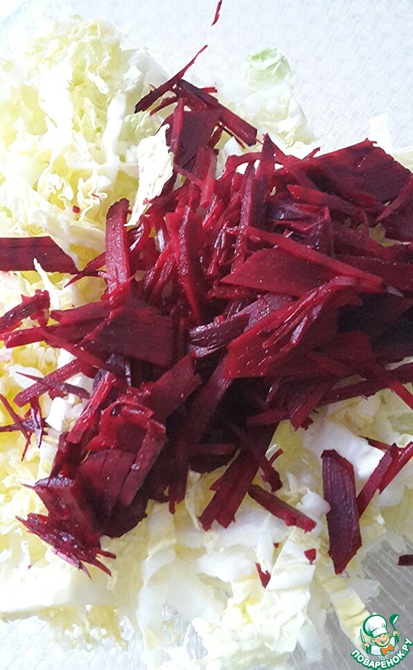 Сырую свеклу чистим ( я сырую свеклу всегда ошпариваю, но этот шаг можно пропустить ) и натираем на терке соломкой.
