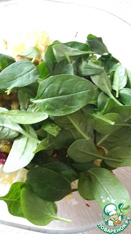 Добавляем листья шпината. Можно взять любые салатные листья - мизуну, мангольд, рукколу или их смесь.
