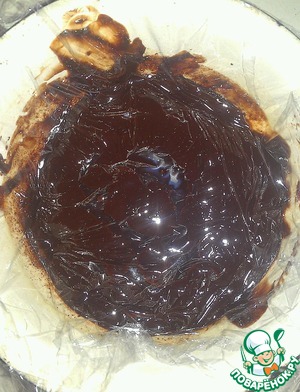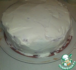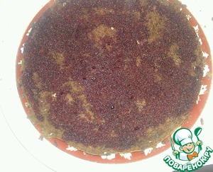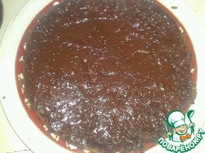 Нижний корж кладем на блюдо и хорошо пропитываем вишневым сиропом.