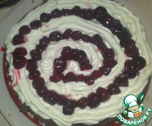 Продолжаем собирать торт. Кладем второй корж. Пропитываем сиропом. С помощью кондитерского шприца выдавливаем сливки в форме улитки. В образовавшуюся ложбинку выкладываем вишни.