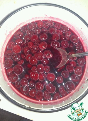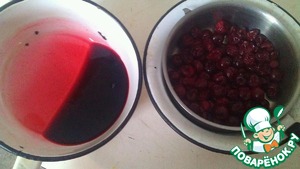 Переложить вишни (у меня замороженные) в друшлаг, а под него какую-то емкость, что бы туда истек сок с вишен. Оставить вишни до полной разморозки (я сделала это с вечера и оставила в холодильнике). Должно получиться примерно 170мл сока. Если сока не достаточно, можно добавить воды. Всыпать в сок сахар, поставить на огонь, прокипятить несколько минут. -