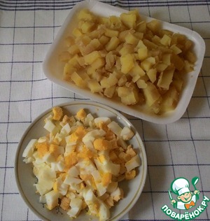 Отварной картофель и яйца почистить, нарезать мелким кубиком.