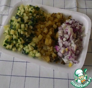 Так же, кубиком, порезать свежий и маринованный огурец и лук.