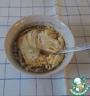 Подготовить заправку: смешать сметану, соевый соус, горчицу и смесь перцев.