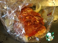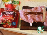 Кусочек свинины разрезать вдоль, не дорезая до конца. Отбить. Посолить, поперчить по вкусу, намазать сверху 2 ст. л. кетчупа. |
