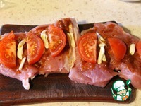Зубчик чеснока нарезать соломкой, помидор нарезать полукольцами. Выложить поверх свинины помидоры и чеснок, чередуя. |