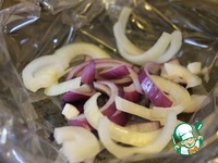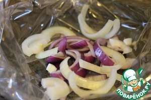 Лук нарезать крупными полукольцами и сложить в рукав для запекания. |