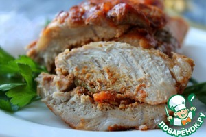 Сверху лука положить мясную "книжку". Запекать в заранее разогретой до 200 градусов духовке 20 минут. Затем уменьшить огонь до 180 градусов и запекать еще 40 минут. |