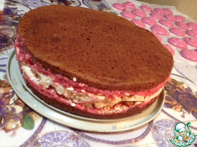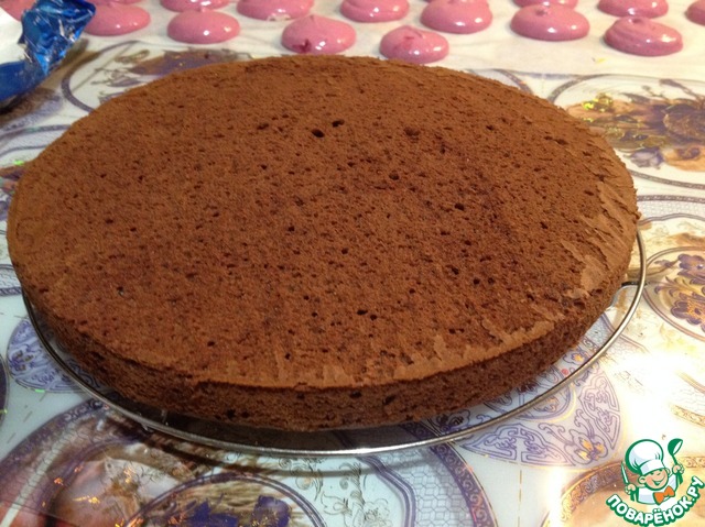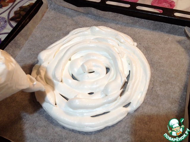 Массу выложить в п/э пакет, срезать уголок и выдавить на бумагу для выпечки в виде круга, равного размером коржам из теста.