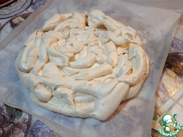 Безе высушивать при температуре 60-80 градусов до твердости. (У меня ушло 3 часа, но я оставила немного влажную внутри меренгу, до полной сухости часов 5). Можно чуть сократить время, предварительно заварив взбитые с сахаром белки на водяной бане в течение 15 минут, взбивая миксером до густоты. Тогда меренгу выпекаем в течение 1 часа при минимальной температуре.