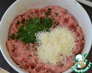 Тертый твердый сыр, соль, перец (по вкусу) и нарубленную петрушку.
