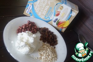 Сначала нужно подготовить необходимые продукты: Творог, изюм, арахис и хлопья.