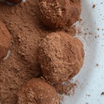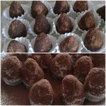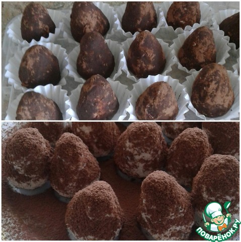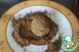 Затем насыпать в тарелку какао-порошок. Из творожной массы сформировать трюфели и обвалять их в какао-порошке.