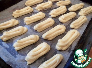 Выложить тесто на пергамент в виде небольших эклерчиков. У меня получилось 20 штук.