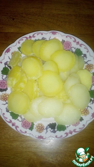 Картофель сварить в кожуре, почистить, нарезать кругляшками