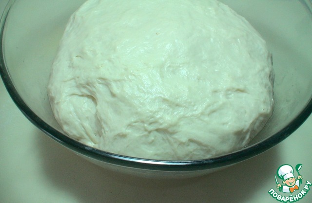Миску обмазать растительным маслом, выложить тесто, затянуть верх миски пленкой и поставить на брожение. Я обычно ставлю в микроволновку вместе со стаканом кипящей воды. Тесто должно увеличиться в два раза.