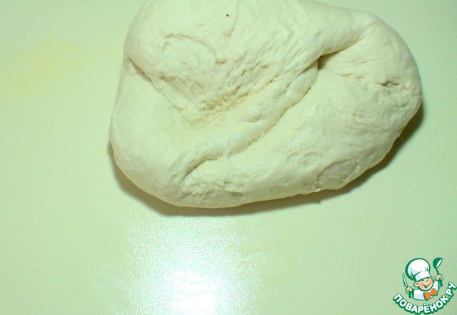 В просеянную муку втереть дрожжи, добавить соль, сахар, сухое молоко, творог. Влить воду, добавить растительное масло. Замесить тесто. Тесто получается липкое, муку не добавлять.
