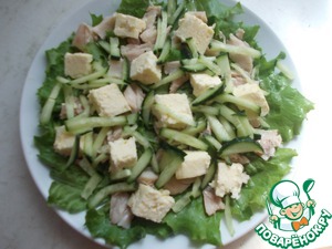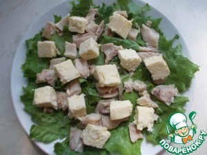 Чистые листья салата рвем руками и раскладываем на тарелки, сверху кусочки курочки и кубики сыра.