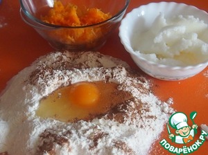 Тыкву натереть на мелкой терке. Просеянную муку смешать с сахаром и корицей. Добавить яйцо и жир, замесить тесто. Завернуть тесто в пищевую пленку и отправить в холодильник на 30 минут.