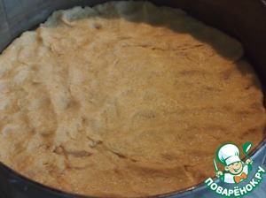 Тесто достать из холодильника, разделить на две части. Дно разъемной формы для торта (диаметр моей формы 23 см) застелить бумагой для выпечки. Половину теста распределить по дну формы и выпекать в разогретой духовке при температуре 180 градусов примерно 15 минут.