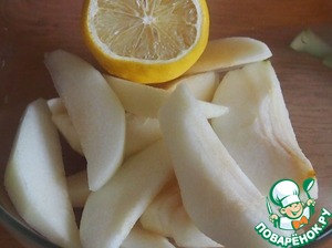 Груши очистить, отстранить серединку, нарезать на дольки, чтобы они не потемнели покапать соком лимона. Груши должны быть достаточно спелыми и мягкими. Дольки твердых и не очень сладких груш нужно будет пару минут поварить в сахарном сиропе, не допуская, чтобы они разварились. Вместо груш можно использовать и яблоки.