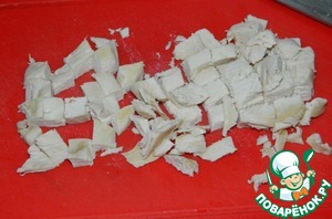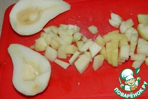 Груши очистить, удалить сердцевину, нарезать и добавить к куриному филе.