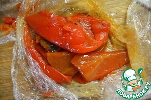 Болгарский перец запечь до мягкости и снять кожицу.