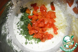 Нарезать перец кубиками и добавить вместе с измельченной зеленью в творожную массу.