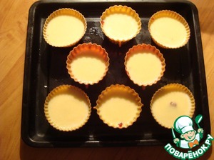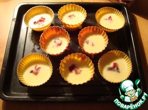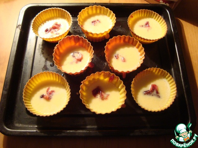 Взяла силиконовые формочки, намочила их и до половины разлила в них тесто. Выложила джем.