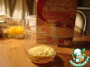 Взяла хлопья для завтрака пшённые ТМ Мистраль. Насыпала их в стакан. Молоко подогрела и вылила в хлопья. Отставила стакан, чтобы хлопья разбухли. Начала делать тесто.