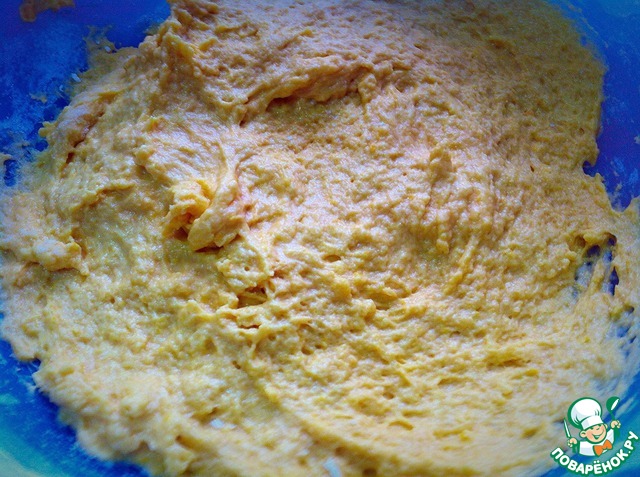Муку соединить с соль, добавить тыквенное пюре с дрожжами и хорошо перемешать. Можно сделать это миксером с насадками для теста. Тесто получается жидковатое. Так и должно быть, не пугайтесь. Затем добавить в тесто 3 ст. л. оливкового масла и вымешать ещё немного.- тесто должно получится рыхлым. На данном этапе я просто хорошо все перемешала ложкой. Накрыть тесто полотенцем и убрать в тёплое место. Пусть подходит.