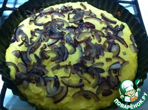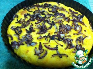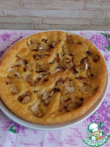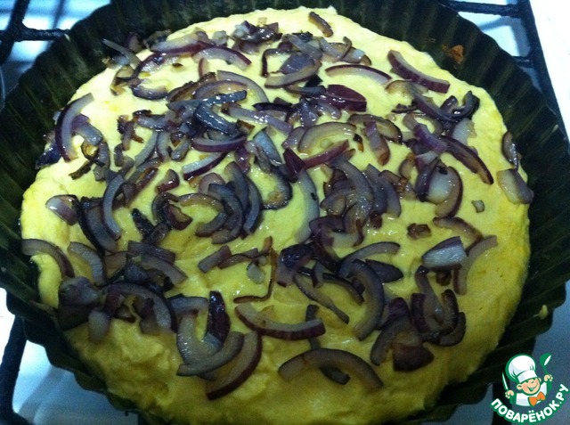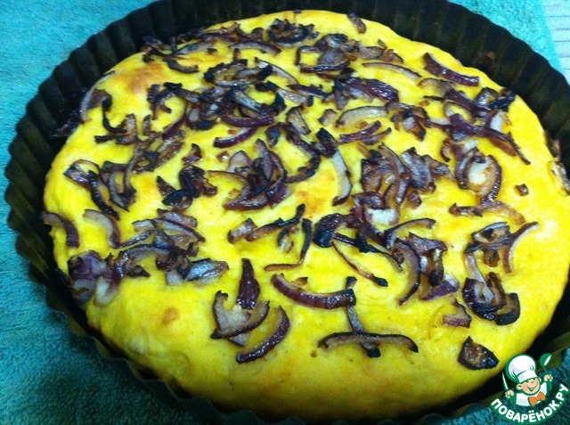• Тем временем лук почистить и порезать полукольцами. У автора рецепта лук был порезан крупно, дольками. Мне это не понравилось. Порезала потоньше и зря. Он пригорел. Так что лучше порезать потолще. И обжарить на смеси масел (1 ст. л. оливкового и 1 ст. л. сливочного) на медленном огне до прозрачности. Форму для выпечки ( автор предлагает брать овальную форму, так как фокачча и должна быть такой формы, но за не имением таковой, взяла круглую :)) смазать маслом, выложить наше подошедшее тесто и разровнять его ( повторюсь, тесто жидковатое, не пугайтесь). Сверху выложить лук распределив его по всей поверхности теста. Отправить форму с тестом в разогретую до 200 С духовку. Через 10 минут понизить температуру до 180 С и выпекать ещё 20 минут. Ну или ориентироваться на свою духовку.
