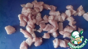 1) сырое мясо (мясо лучше взять не жирное, например свиная вырезка или карбонат, из него вкуснее), нарезаем не большими кубиками, примерно по 1см.-1,5см. (если нарезать большими кубиками будет долго готовиться), -
