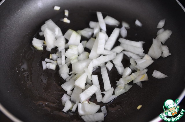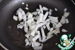 • Лук режем мелкими кубиками и обжариваем на растительном масле (1 ст. ложка) до прозрачности.