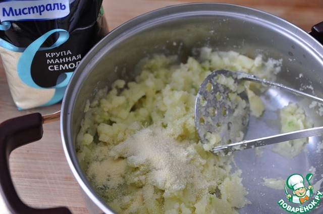 • С готовых картофеля и цуккини сливаем всю воду, и горячие разминаем толкушкой (можно использовать блендер), добавляем 2 ст. ложки крупы манной семолина от "Мистраль". Перемешиваем. Отставляем остыть и дать набухнуть манной крупе.
