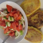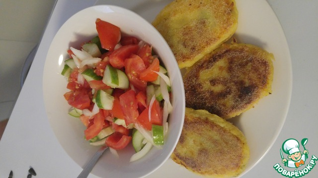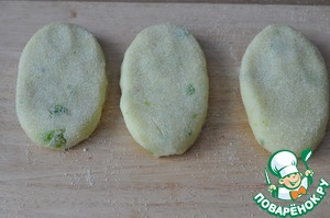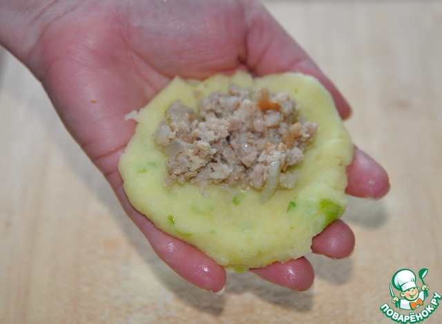 • Когда овощная смесь остынет, берём в руку лепёшку из "теста", кладём на неё столовую ложку мясного фарша и лепим "котлету".