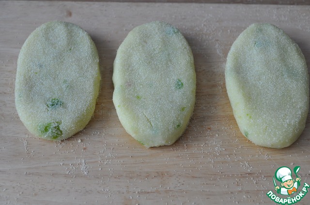 • Доску посыпаем манной крупой семолина от "Мистраль" (1 ст. ложка) и на ней обваливаем зразы.