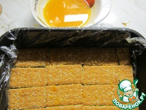 Печенье обмакиваем в мандариновый сок и выкладываем нижний ряд. -