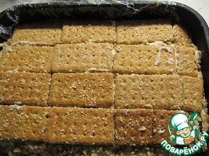 • Смазываем кремом. Посыпаем измельченным грецким орехом. Выкладываем следующий ряд и снова смазываем кремом. Последний слой кремом смазывать не надо.